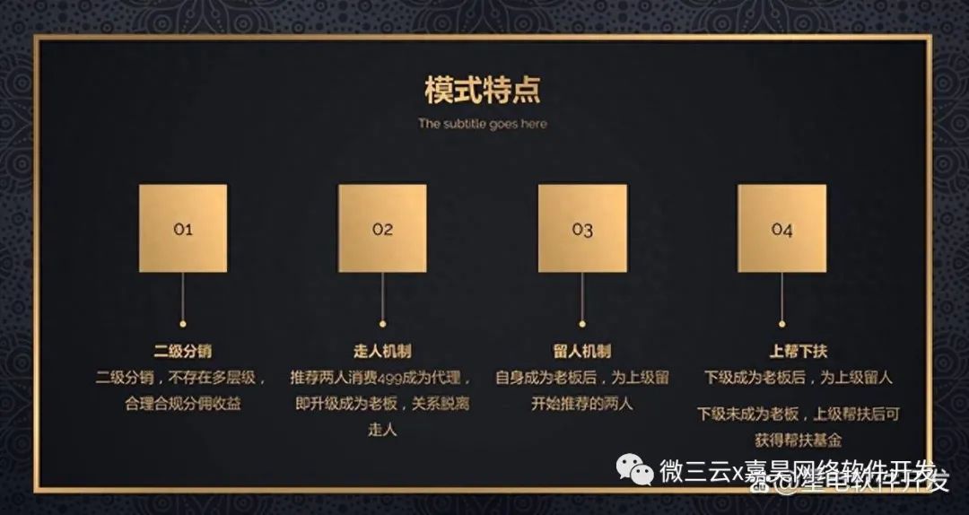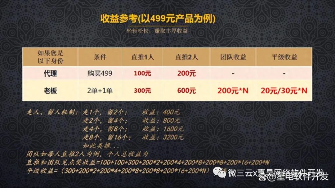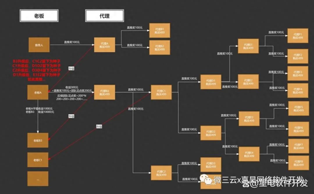 2. 直推奖励:代理需要直接推荐两个人成为代理,才能升级为老板身份。当代理成功直推后,将获得一定比例的直推奖励。