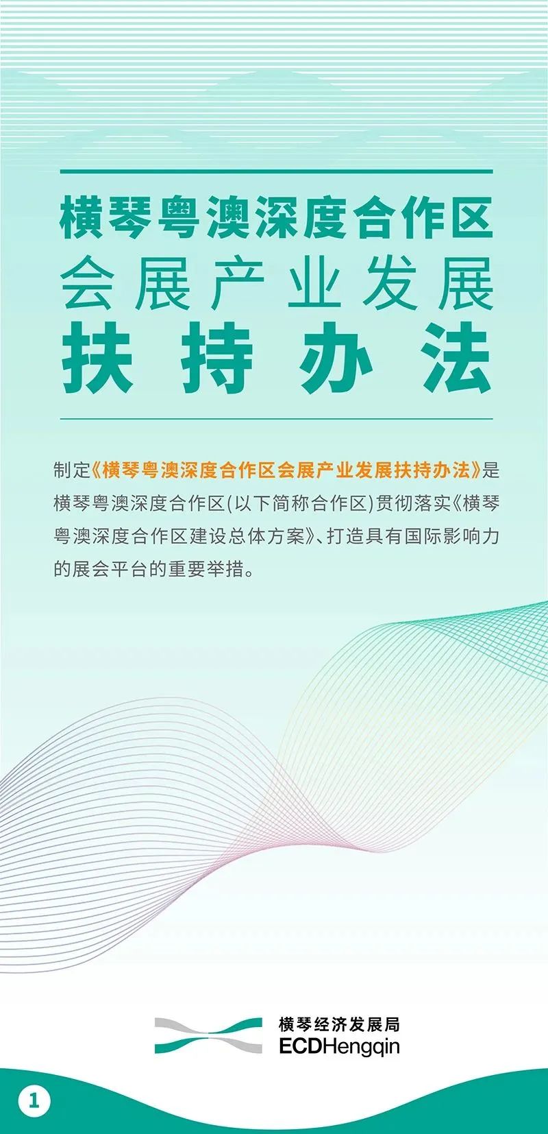 横琴粤澳深度合作区,为贯彻落实《横琴粤澳深度合作区建设总体方案》打造具有国际影响力的展会平台,《横琴粤澳深度合作区会展产业发展扶持办法》于2023年7月10日正式印发;