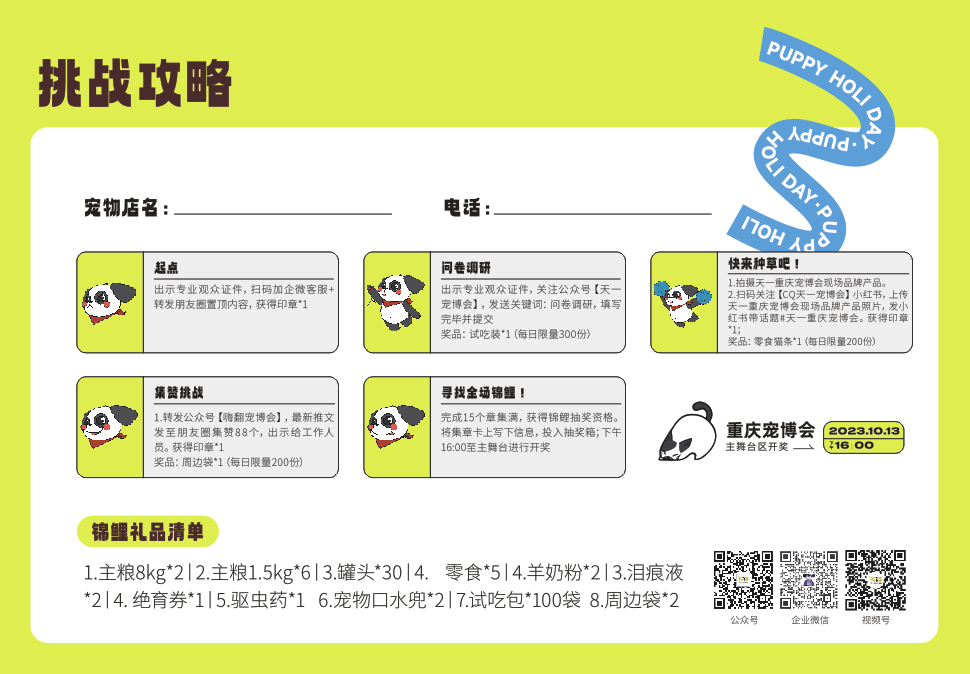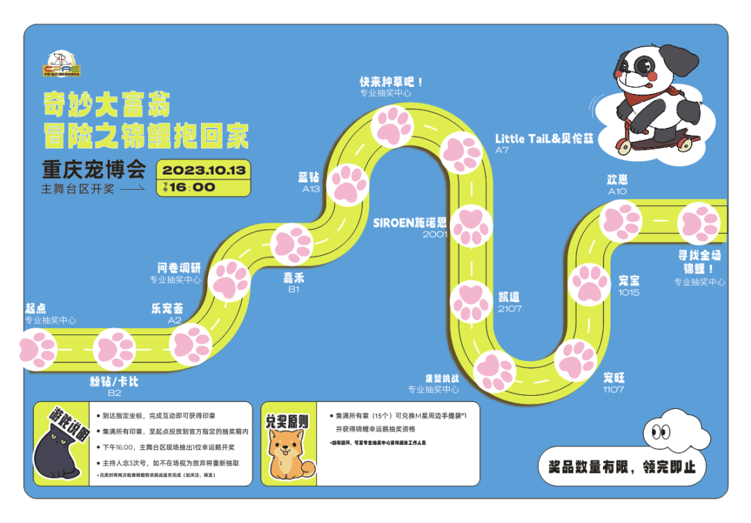 专业观众日现场集章打卡,参与锦鲤抽奖!锦鲤毛孩独享万千宠爱!按照下方路线打卡即可获得丰厚奖品!