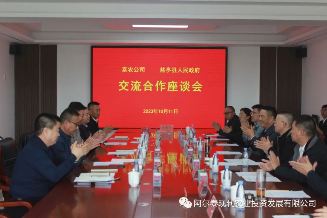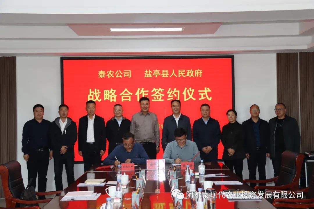 10月11日上午,泰农公司与盐亭县人民政府、泰农公司所属一农场子公司与盐亭县农旅公司在二牧场会议室分别签署战略合作协议,标志着双方开启深化战略合作,依托双方主导优势产业,完善产业交流促进产业互动,推动构建跨区产业生态圈,实现各自产业集群发展,促进产业链进一步延伸,实现产业共兴、资源共享的高质量发展。盐亭县县委书记何长鹰、盐亭县政协党组书记、主席衡洪志、盐亭县政府党组成员、副县长吴鸿飞同志、财政局、农业农村局、盐亭县农旅公司负责人等一行7人;泰农公司党委书记、董事长王进安,总经理努尔波拉提·叶斯木拉提同志及领导班子成员、中层干部代表、职工代表参加签约仪式。