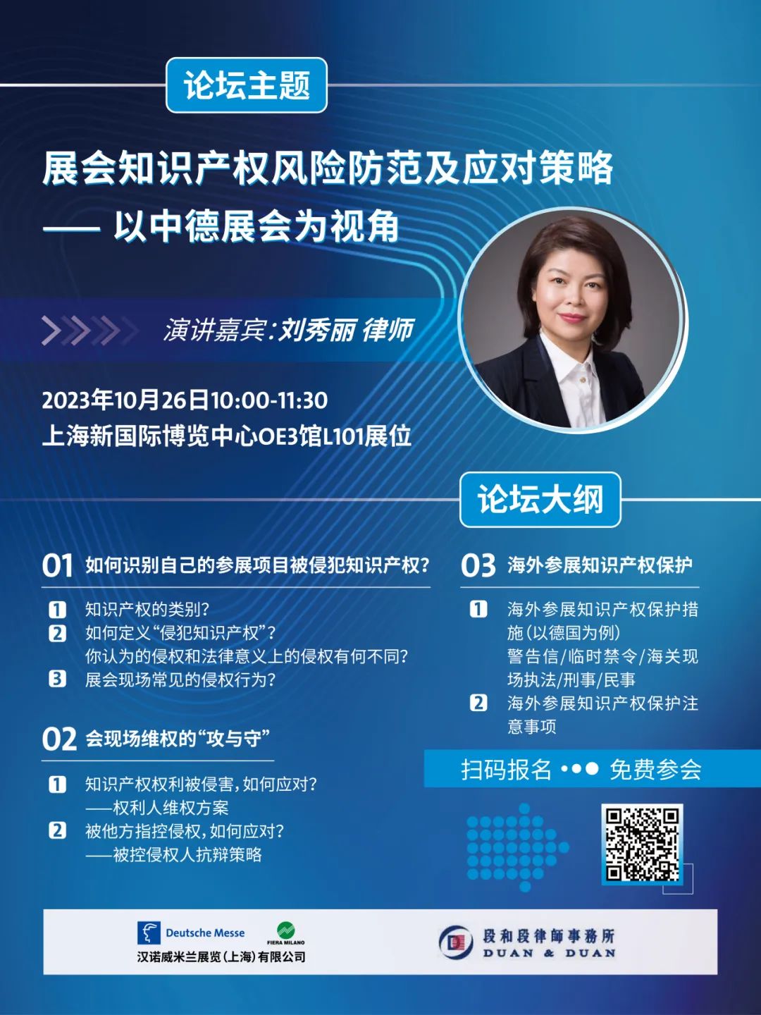 2023年是各行业重振信心的一年,也是先进制造业发展的关键一年。会展业也迎来了全面复苏,企业积极参展,同时重启境外参展之路。展会是知识产权的集聚地。2022年7月20日,国家知识产权局印发了《展会知识产权保护指引》通知,旨在加强展会知识产权保护,促进会展业健康发展。汉诺威米兰展览(上海)有限公司作为汉诺威上海工业联展的主办方,希望通过论坛分享的方式,以案说法解析中国展会知识产权维权/救济中运用普遍的法律措施和德国展会中的临时禁令程序,以提高展会参与者的维权能力和被控侵权时的应对能力。