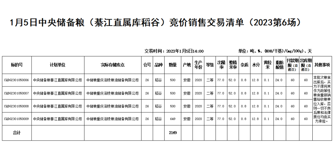 受中国储备粮管理集团有限公司成都分公司委托,重庆市粮油批发市场有限责任公司(即国家粮食重庆交易中心,以下简称“批发市场”)定于2023年1月5日14:00举办中央储备粮(綦江直属库稻谷)竞价销售交易会,现将有关事项公告如下:1. 标的号:CQDG2301050006—CQDG2301050009。2.产地、年限及数量:安徽2020年产稻谷2149吨。4. 承储库点及仓号:中储粮重庆涪陵粮油储备有限公司26号仓。5. 标的质量:以交易清单质量指标为准。有意向参与交易的会员可通过“重庆粮网”(www.grainmarket.com.cn/centerweb/region/CQ)、“重庆粮食集团”官网(www.cqgrain.com)→资料下载→《竞价销售粮油看样单》路径,填写后加盖公章邮寄或扫描至批发市场,经批发市场审核盖章后,提前实地查看粮食实物质量和路况、出库条件等情况,确保所竞买的粮油符合自身使用用途,自主确定是否购买,并承担竞买后相应责任和市场风险。如未提前看样或看样后参与交易的,均视同认可标的质量,成交后不得再对质量提出异议。卖方出库过程中不得掺杂使假,严格按照合同规定执行。6. 本次交易清单附后。具体交易品种和数量等信息如有变化,以即时公告及交易清单为准。1. 报名资格:国内具有粮油生产、经营资格的企业或个人且在国家粮食交易平台注册的有效会员。2. 报名时间:2023年1月5日12:00前。报名参与交易即视作全面承认并遵守《中央储备粮竞价销售交易规则(试行)》和交易公告、交易清单等要求。1.本次竞价交易使用国家粮食交易平台地储交易系统,2022年1月5日14:00通过网络对委托标的依次按交易节进行交易。请报名参加竞价交易的会员按时登录国家粮食交易中心官网(www.grainmarket.com.cn)→点击网页上方“请登录”或右方“用户中心”进行会员登录→点击“交易”板块→选择“重庆市场”→“1月5日中央储备粮(綦江直属库稻谷)竞价销售交易专场”。1. 保证金的收取和释放:参与竞价交易的会员须交纳保证金160元/吨(其中:履约保证金150元/吨和交易保证金10元/吨),必须于2023年1月5日12:00前到达批发市场指定银行账户,确保有足额的保证金进行交易。单笔合同交割完毕后,保证金释放。如合同部分交割,该合同数量的所有保证金处于冻结状态。2. 保证金转入:汇款时请备注“保证金”,待资金到账后,进入系统“用户中心”的资金界面,点击用户名称下方的“交易账户:明细”,将足额保证金“转入”重庆市场。3. 交易手续费:按成交金额的0.8‰向买方收取。1. 成交价格:为交易系统确认价格,即卖方承储库仓前散装车板交货价格,不含包装及整理费用,无出库费,无水、杂增扣量。如买方有包装以及整理要求,可与卖方协商,费用按照协商一致的标准另行结算。2. 合同签订:自成交之日起3个工作日内,买卖双方在交易系统内签订电子购销合同或以邮寄、扫描等方式签订,如逾期未签订购销合同,则对违约方作违约处理。3. 付款及出库:买方自成交之日起60天内付款完毕,60天内出库完毕。买方成交后将货款一次或分批汇入批发市场指定银行账户。买方在“我的合同”中点击“支付货款”来完成出库通知单申请。批发市场收到申请后,及时审核并开具《出库通知单》。4. 结算:出库完毕后买卖双方签订《验收确认单》,由卖方送达批发市场,批发市场在2个工作日内按《验收确认单》办理货款结算。2. 开户银行:中国农业银行股份有限公司重庆九龙坡中梁山支行 3. 账 号:31-0707010400088881. 本场交易规则详见“重庆粮网”(www.grainmarket.com.cn/centerweb/region/CQ)、“重庆粮食集团”官网(www.cqgrain.com)《中央储备粮竞价销售交易规则(试行)》,与此规则不一致的以本次公告为准。2. 会员在交易前到委托方存储库点看样或成交后到委托方存储库点提货时,需遵守当地的疫情防控政策,做好疫情防控工作。3. 本批次粮食出库后,买方不得将其作为政策性粮食重新销售给收粮单位入库,否则一切不良后果和法律责任均由买方承担。4. 各会员单位发现以陈顶新、转圈粮、套取财政补贴、人为设置障碍造成出库难、不执行出库质量检验制度等违法违规问题的,请拨打12325举报。5. 市场交易部联系电话:023-65269777 023-65269283▶ 网站 | www.grainmarket.com.cn/centerweb/region/CQ