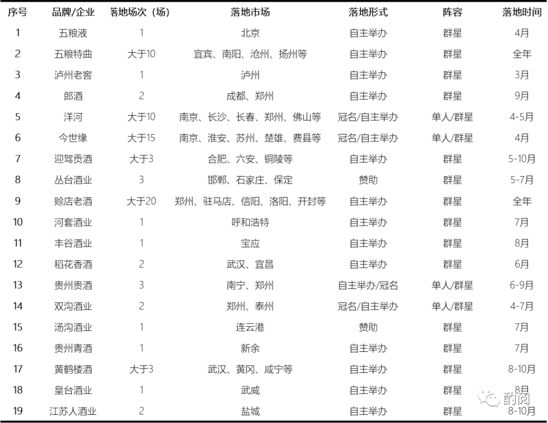 截止到9月参加演唱会的品牌和酒企,以名酒系列酒品牌(这里将名酒收购的其他品牌也作为系列酒品牌)和区域第二阵营的酒企为主。诸如在河南五粮特曲、湖北的黄鹤楼;在江苏的今世缘、安徽的迎驾贡酒、河北的丛台、河南赊店以及贵州贵州酒等。他们的身份与位置基本相同,都面临着全国名酒、区域龙头等品牌下压,和地方酒企向上蚕食。