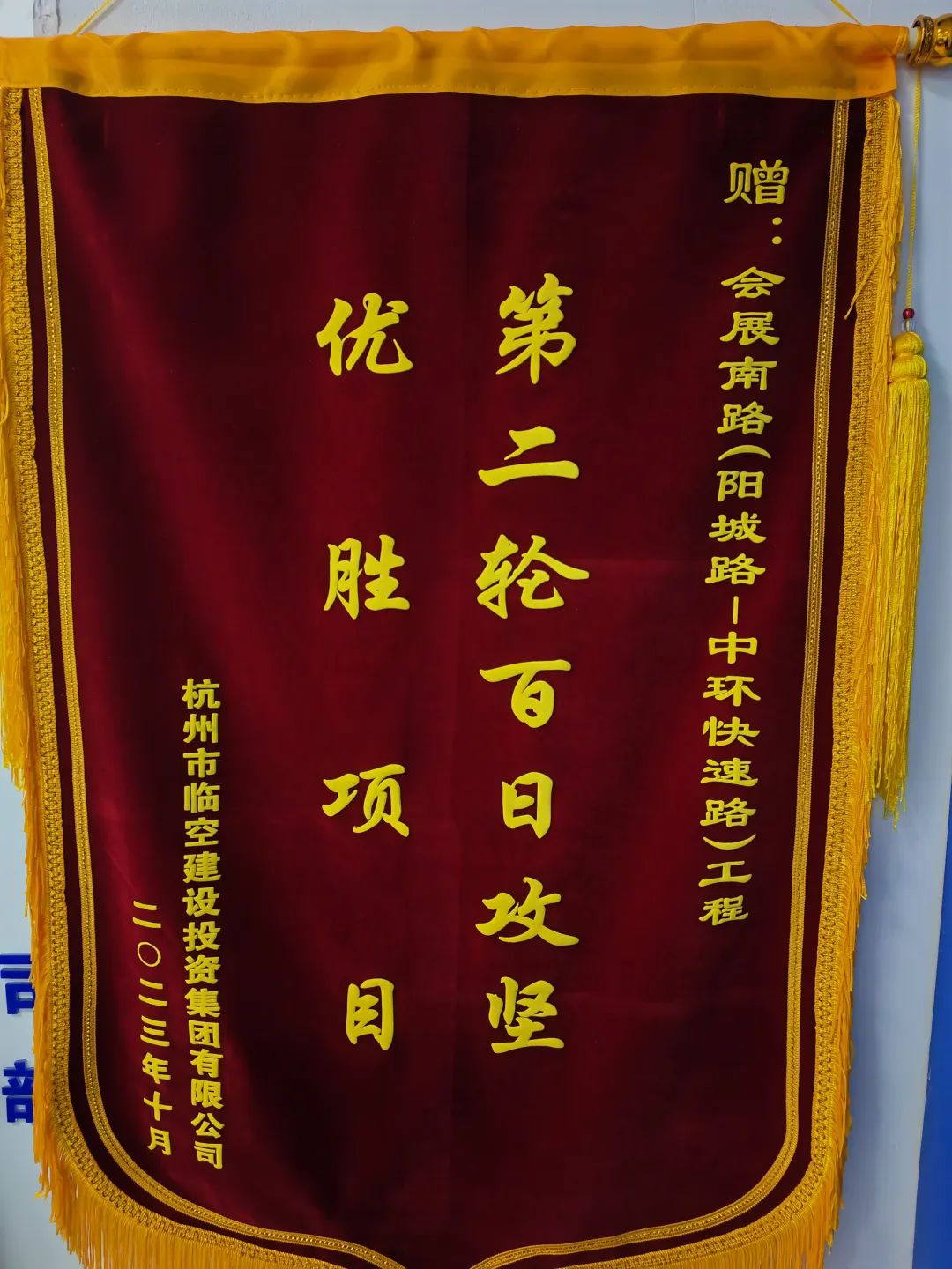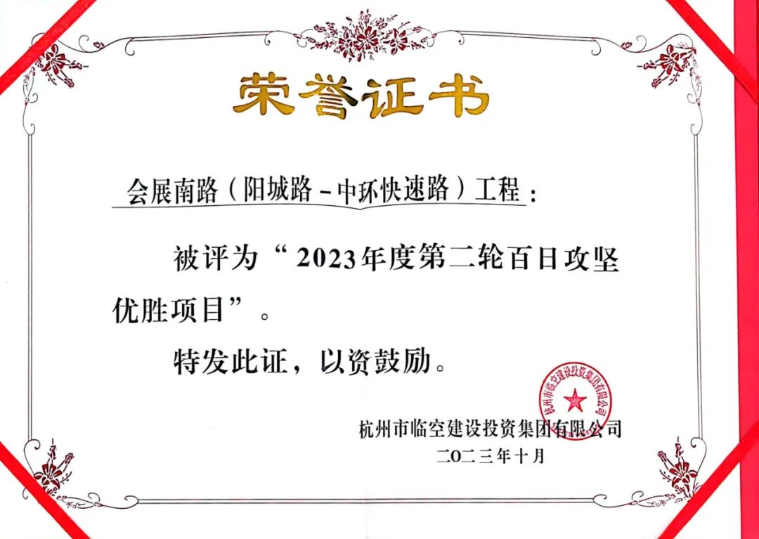 10月12日,在杭州市临空建设投资集团有限公司2023年度第三轮百日攻坚行动誓师大会上,由公司承建的会展南路(阳城路-中环快速路)施工项目荣获“2023年度第二轮百日攻坚优胜项目”,全线综合评比第一名优异成绩。