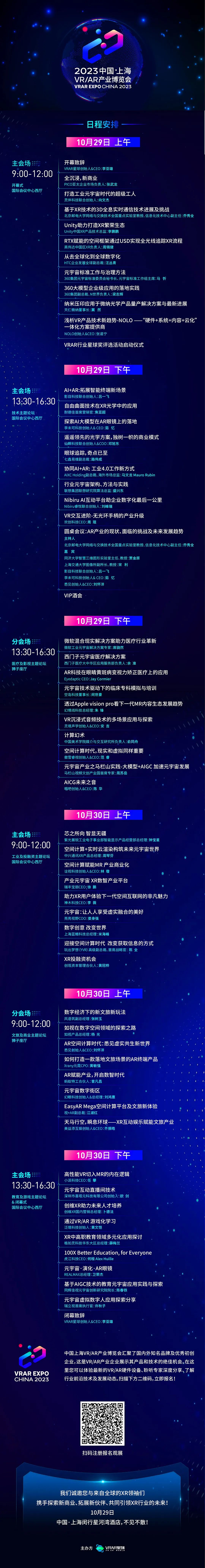 融合共生、协同发展!中国VRAR产业博览会将携手全球VR/AR从业者,于10月29日-10月30日齐聚上海,共同引领XR产业未来的发展。本次大会为期两天,设有主会场及两大分会场,超过60位重量级嘉宾登台演讲,另有微软、PICO、雷鸟创新、Unity、创维XR、亮亮视野、李未可、灵伴科技、联想、NOLO等知名企业参展。内容涵盖XR技术、工业、投融资、教育、游戏、医疗、影视、文商旅等多个领域。