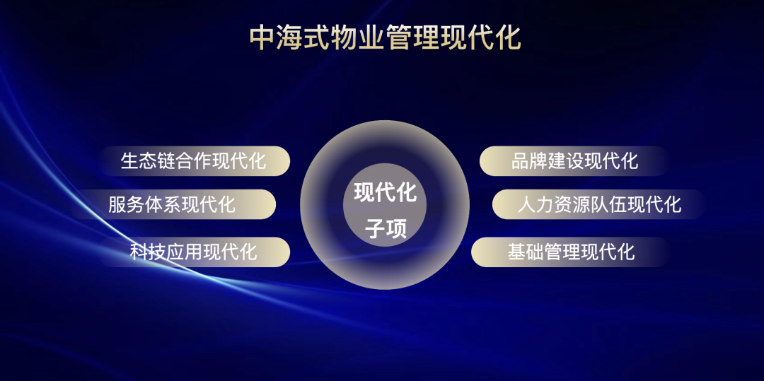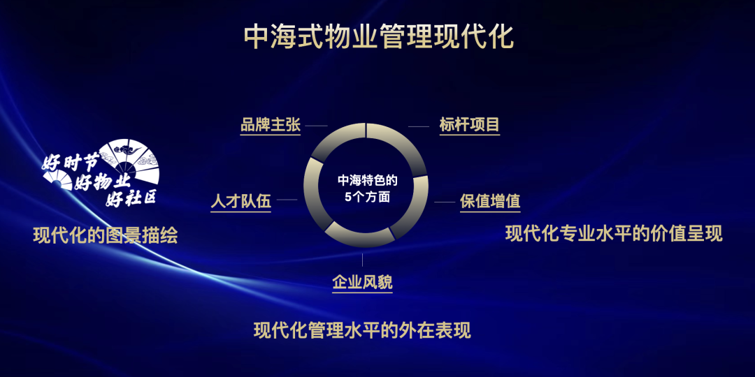 基于5个基础内涵和3类评价对象,中海物业将现代化与自身特色实践相结合,提出了“中海式物业管理现代化”,并补充增加了5个方面:品牌主张、标杆项目、保值增值、人才队伍、企业风貌。“好时节 好物业 好社区”既是我们的品牌主张,也是现代化的图景描绘;标杆项目和保值增值,是现代化专业水平的价值呈现;人才队伍和企业风貌,是现代化管理水平的外在表现。