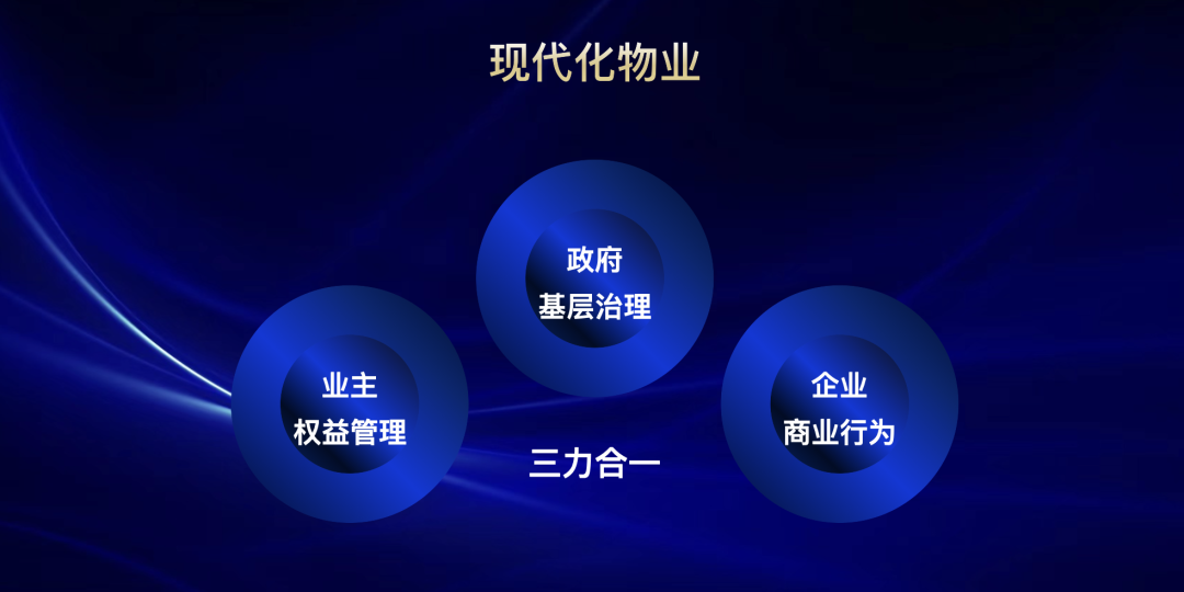 行业发展新阶段,物业要从小区走向城市,从社区服务走向基层治理,从劳动密集走向智慧物业,本质是要从传统物业服务向现代化物业转变。现代化物业就是要将政府的基层治理、业主的权益管理、企业的商业行为,三力合一。