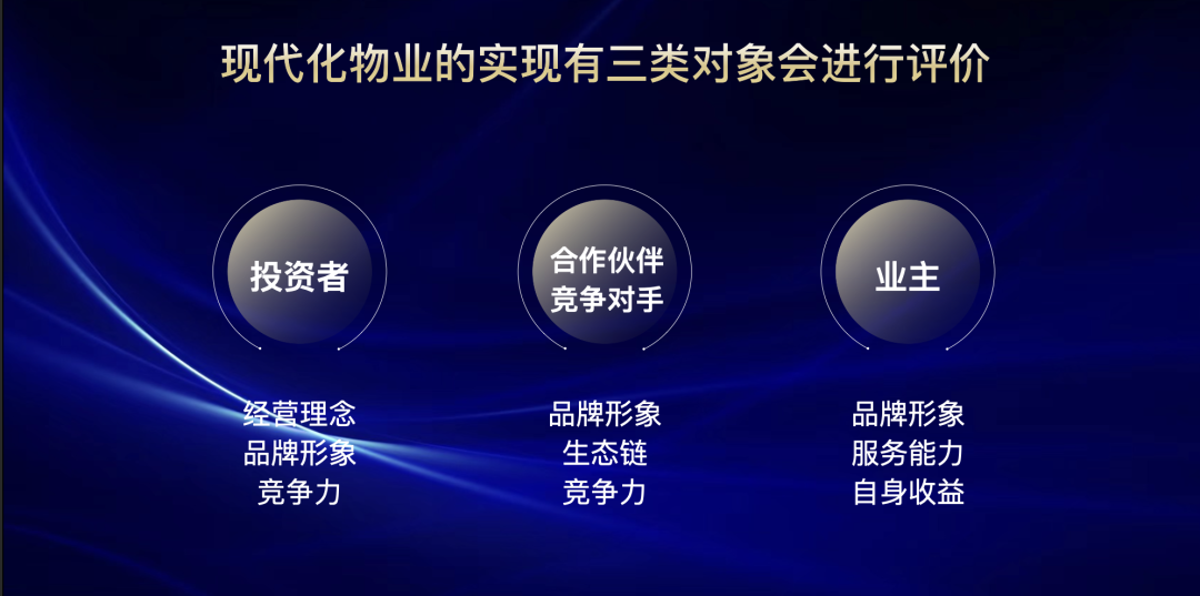 现代化物业的实现有三类对象会进行评价:投资者、合作伙伴/竞争对手、业主。对于投资者而言,更加关注的是经营理念、品牌形象和竞争力;对于合作伙伴/竞争对手而言,更加关注的是品牌形象、生态链和竞争力;对于业主而言,更加关注的是品牌形象、服务能力和自身收益。