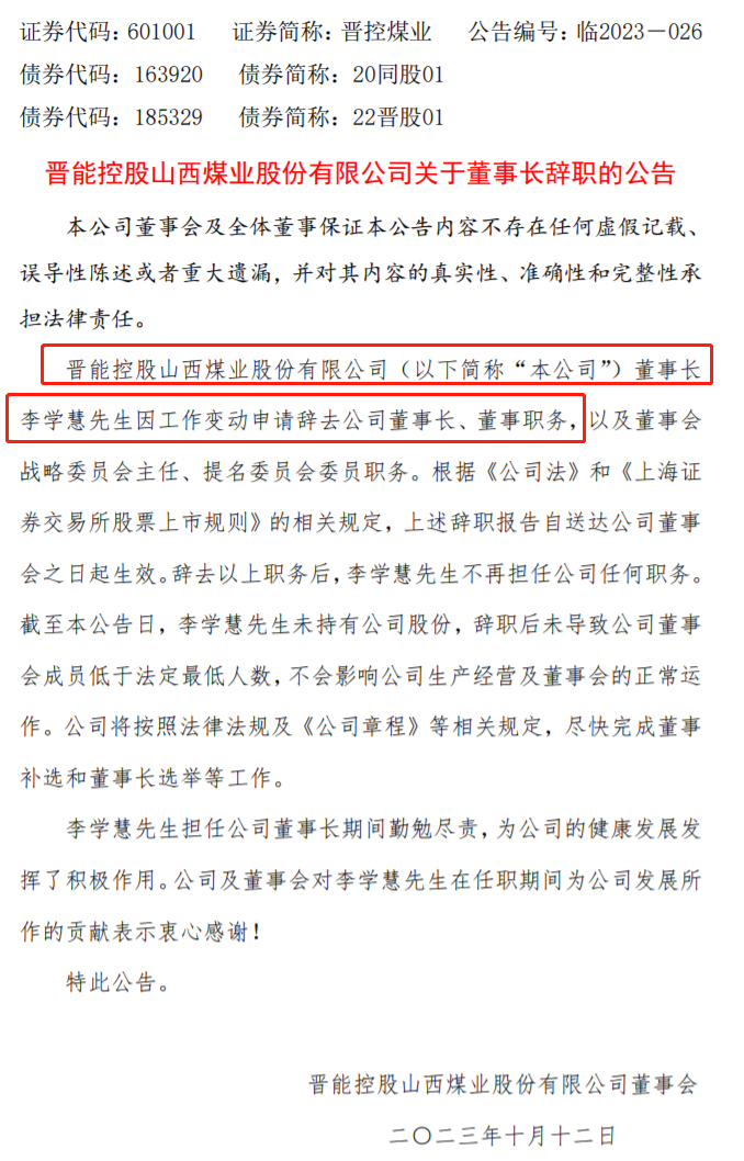 10月12日,山西A股上市公司晋控煤业发布公告,公司董事长李学慧因工作变动申请辞去公司董事长、董事职务,以及董事会战略委员会主任、提名委员会委员职务。辞去以上职务后,李学慧不再担任公司任何职务。