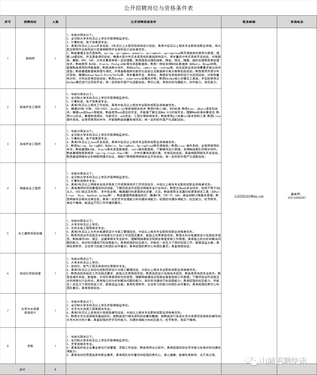 公司招聘8个岗位,共计8人。(公开招聘岗位与资格条件详见附件1)