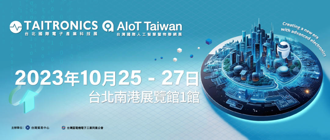 由台湾贸易中心与台湾区电机电子工业同业公会共同举办的2023年「台北国际电子产业科技展(TAITRONICS)」及「台湾国际人工智慧暨物联网展(AIoT Taiwan)」,将于10月25日至27日在台北南港展览1馆盛大登场。