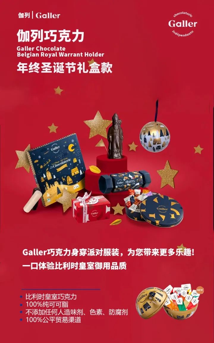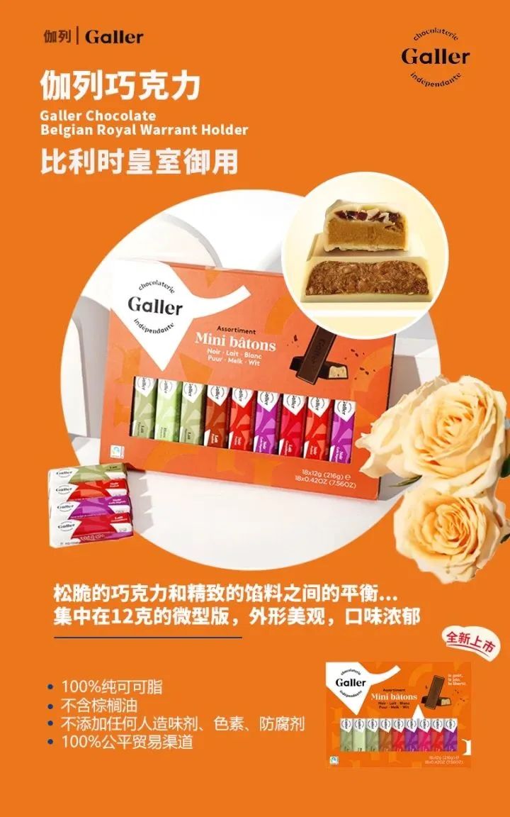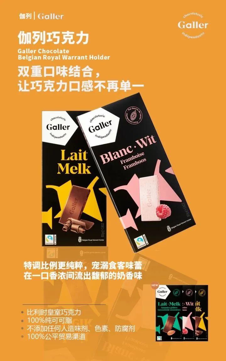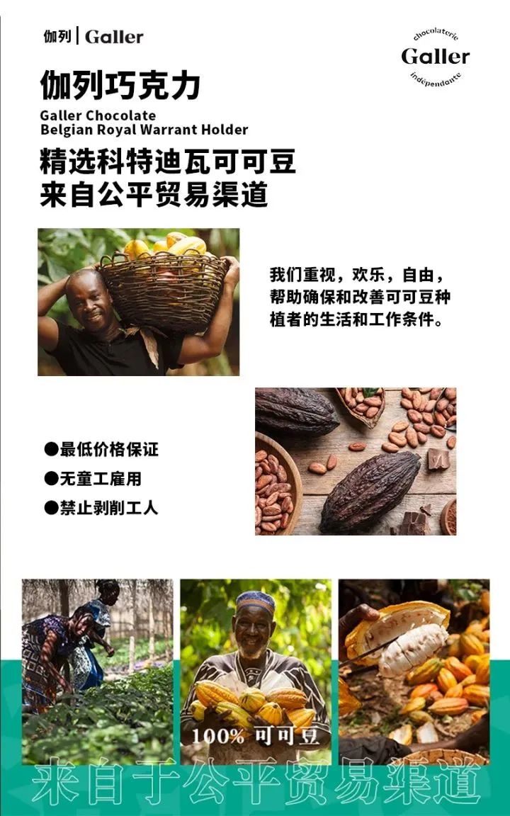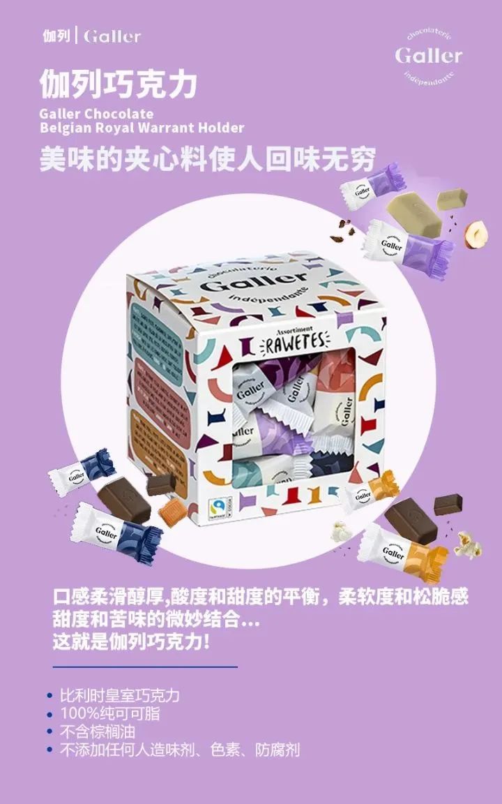 伽列巧克力工厂于1976年创建于比利时列日,是一家由170位巧克力爱好者经营的工厂。一直以来,伽列以满足比利时普通市民、皇家成员在内的全世界人民对优质巧克力的需求为目标,是比利时皇家御用指定巧克力品牌。伽列只使用来自公平贸易渠道的原材料来生产优质的巧克力,产品不含棕榈油,使用100%可可脂、100%公平贸易认证可可豆,不添加任何人造味剂、色素、防腐剂。自2016年起,伽列荣获英国零售商协会(BRC FOOD)国际食品质量认证。