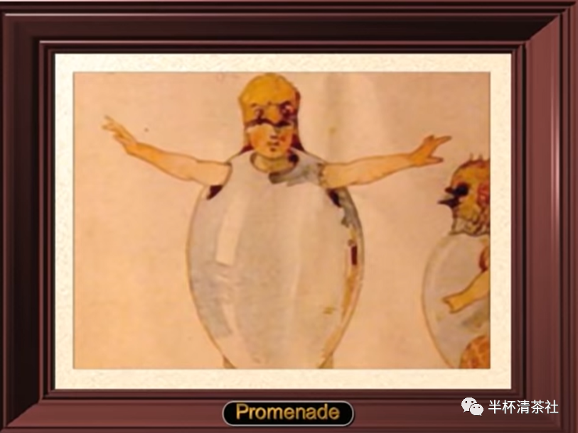 Tuileries Gardens,Die Tuilerien【德】)欢快的音乐节奏是愉悦心情的表达,好像看到嬉戏的孩子们东奔西跑的各种游戏。 IV 牛车(Bydlo: Der Ochsenkarren【德】)沉重的音乐让人想起了《伏尔加船夫曲》。沉重是俄罗斯许多作曲家一个永恒的主题,是俄罗斯人民尤其是农民苦难深重的生活写照。V 未孵化的鸡雏的舞蹈(Ballet