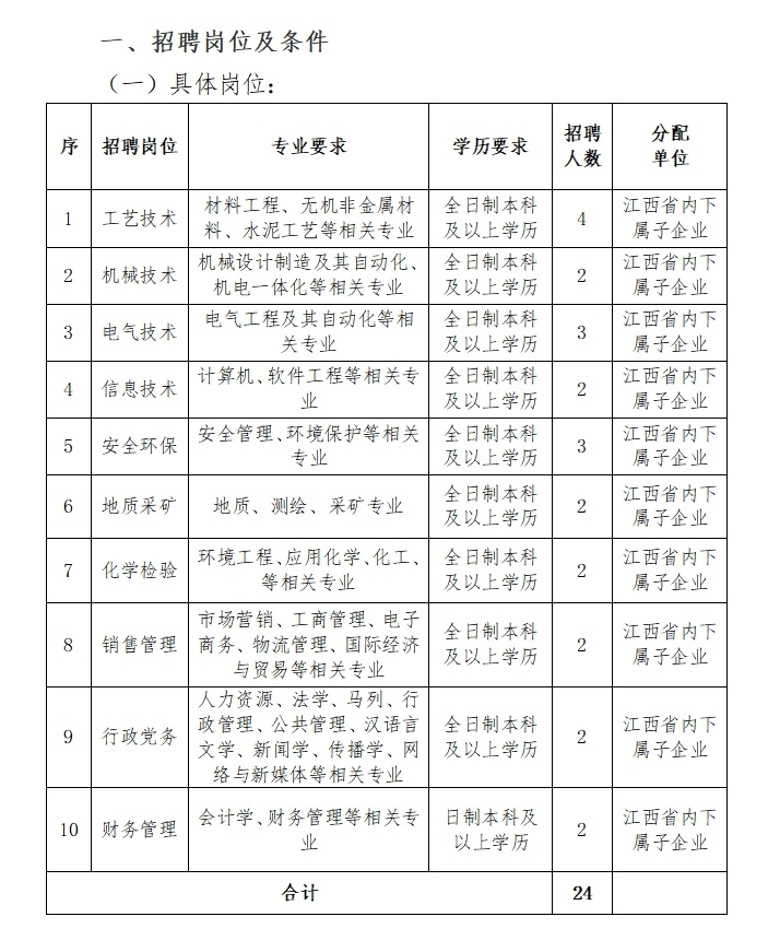 为满足公司的生产经营需求,公司面向社会公开招聘,本次招聘岗位10个,招聘人数共计24人,人员分配到江西省内下属子企业。