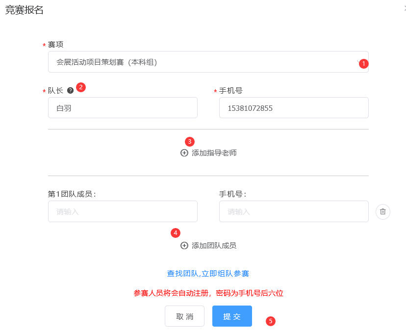 ) 队长:(登录报名的人系统自动默认为队长)。 ( 3 ) 指导老师:输入指导老师信息,手机号和姓名要对应,请按照真实填写。( 4 ) 团队成员:输入团队成员信息,手机号和姓名要对应,请按照真实填写,填写完毕之后点击提交。