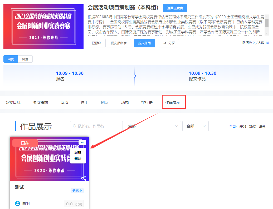 在提交作品时间范围内, 可以点3个点出现编辑和删除的字样,可以对该作品进行重新编辑或删除调整,具体操作如下图13。(请谨慎删除)