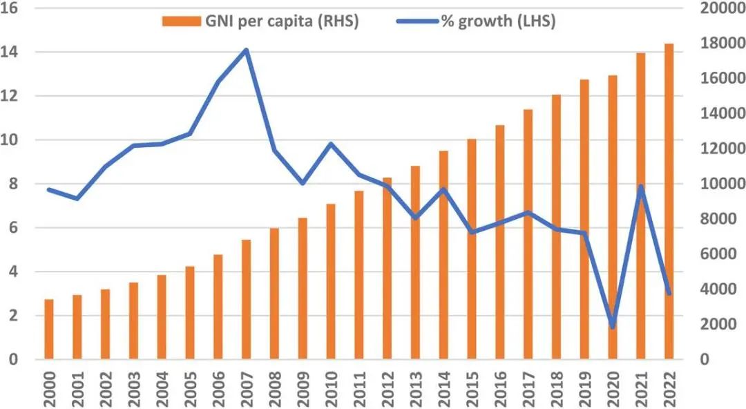 中国实际国民总收入及年增长率(2000年-2022年)