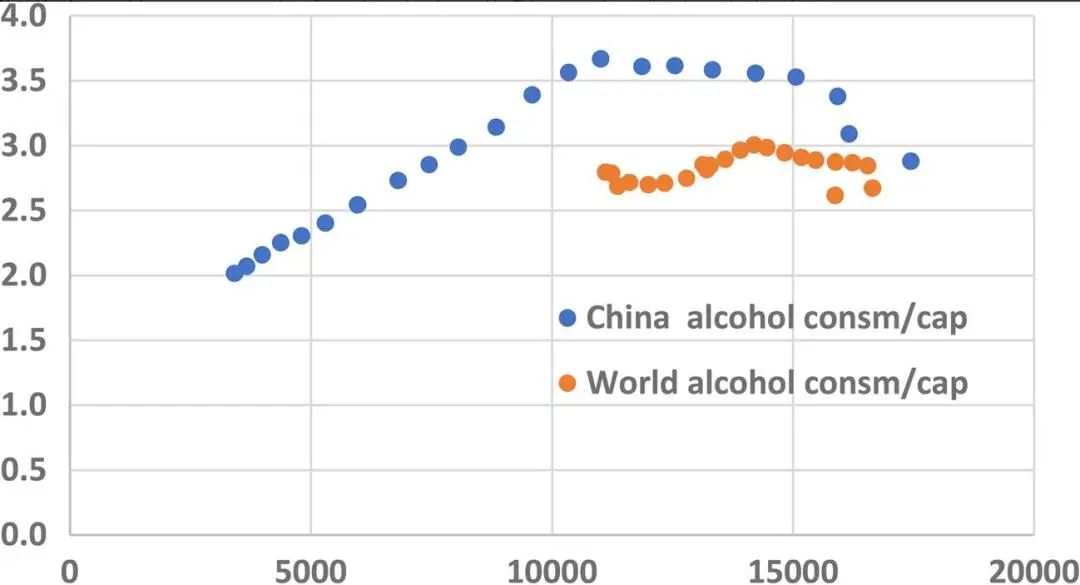 实际国民总收入和人均酒精消费量(中国、全球))