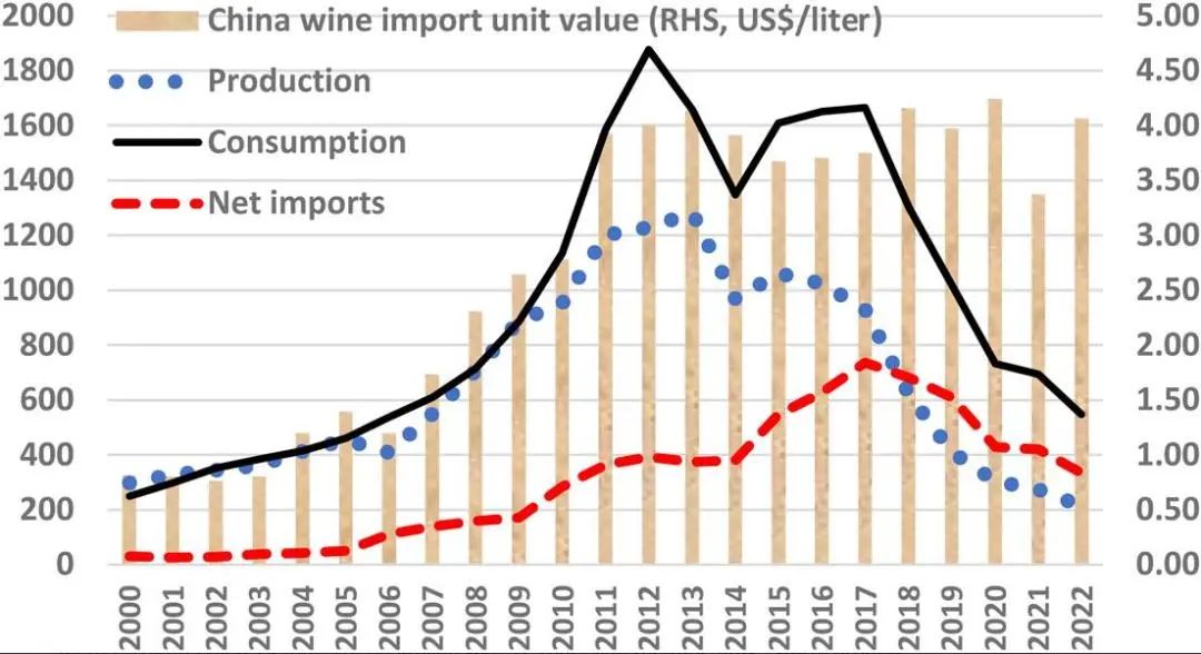 中国葡萄酒产量、消费量、进口量及平均价格变化(2000年-2022年)