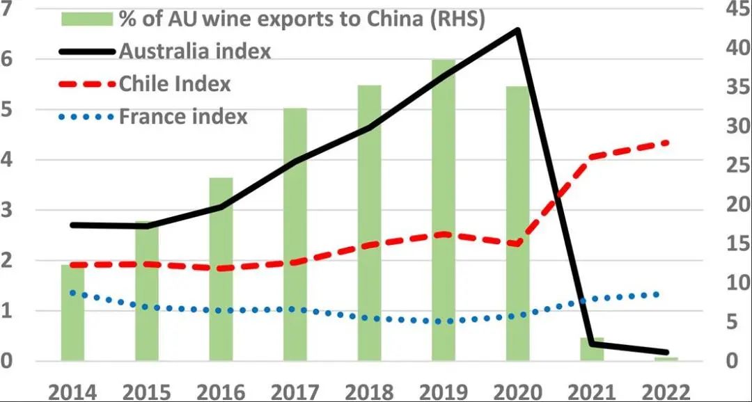 法国、智利、澳大利亚对华葡萄酒出口指数及澳大利亚葡萄酒出口情况(2014年-2022年)