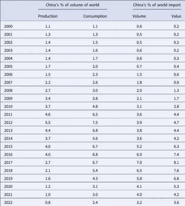 中国在全球的份额占比及全球进口情况(2000年-2022年)