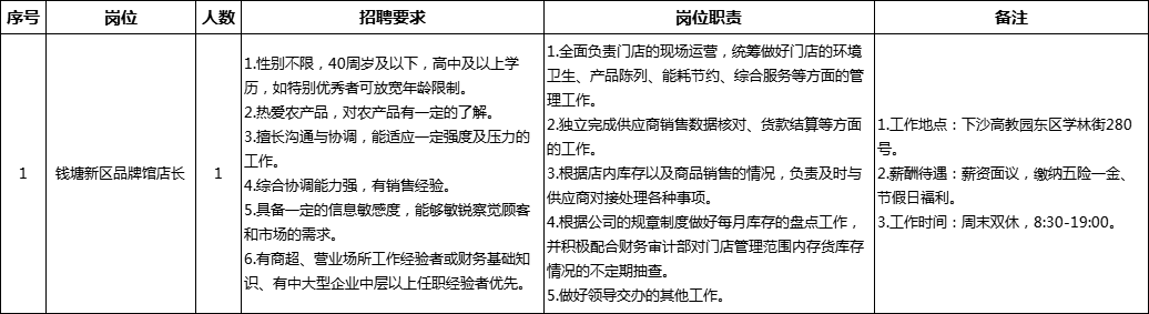 因工作需要,杭州农合联农产品有限公司面向社会公开招聘钱塘新区品牌馆店长1名。现将有关事项公告如下: