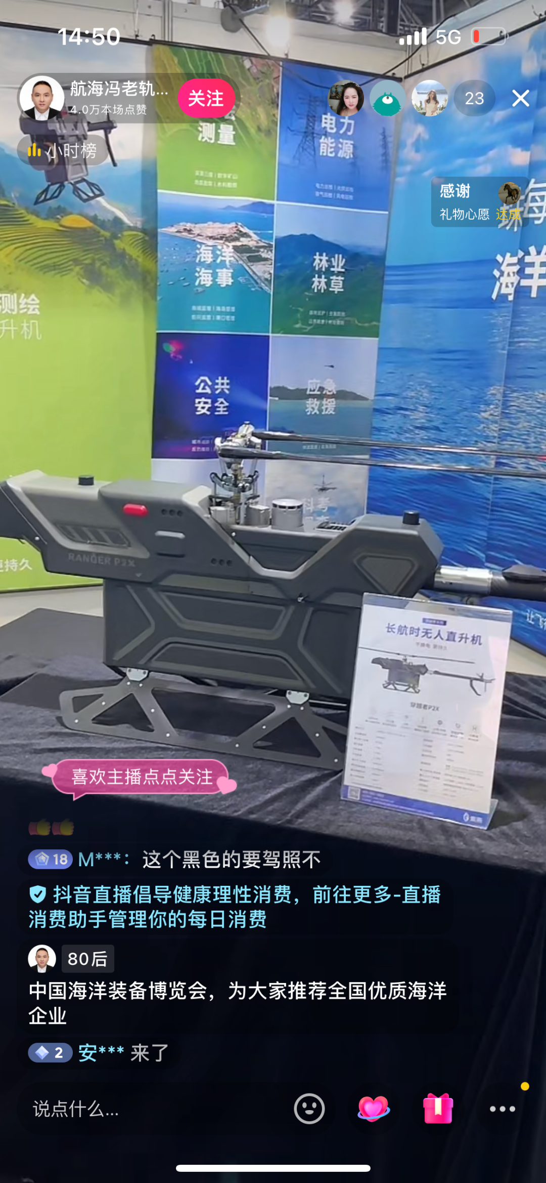 漫步展台,不少观众被两款“硬核科技感”拉满的无人直升机现场圈粉。这是紫燕热门机型——隼10与穿越者P2X无人直升机,具备机动灵活、巡视区域广、抗风性能强、操作简单等优势,各擅胜场;同时,紫燕在推动海洋信息化建设方面的能力和价值也得到了境内外嘉宾们的高度认可;更有行业主播来到紫燕展位,为粉丝现场直播展示无人直升机、互动答疑。