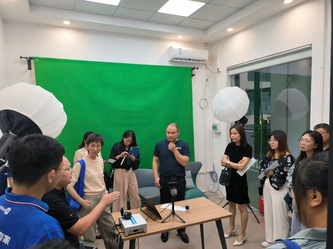 江门市唐人街数字供应链有限公司陈燕换女士参与了互动交流,简单介绍了自身企业的业务开展情况。最后,与会人员在深圳市领贸科技有限公司工作人员的带领下一同来到粤湾云谷四楼的电商直播基地进行参观,了解学习直播间设备的作用及用法。