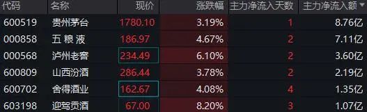 从资金流向来看,截至发稿,主力资金净流入板块超30亿元,其中,贵州茅台、五粮液、泸州老窖分别获净买入8.76亿元、7.11亿元、3.6亿元。