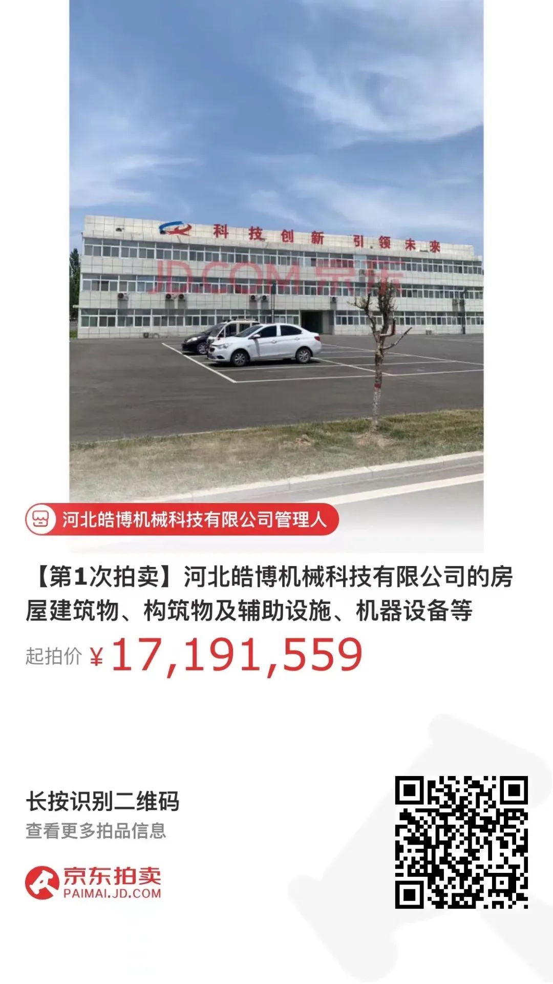 河北皓博机械科技有限公司管理人将于2023年2月7日10时至2023年2月8日10时止(延时除外)在京东拍卖破产强清平台(处置单位:河北皓博机械科技有限公司管理人,监督单位:河北省邱县人民法院,网址:https://auction.jd.com/bankrupt.html)进行公开拍卖活动,现公告如下: