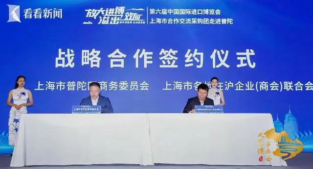 活动现场,普陀区商务委员会与上海市各地在沪企业(商会)联合会签署战略合作协议,双方将通过双向赋能、融合创新,携手向更深层次、更宽领域发展,最终实现企业壮大与区域发展的互利双赢!活动中,还举办了第六届中国国际进口博览会上海市合作交流采购团“放大进博溢出效应,百家商会看进博、进普陀”主题活动启动仪式。