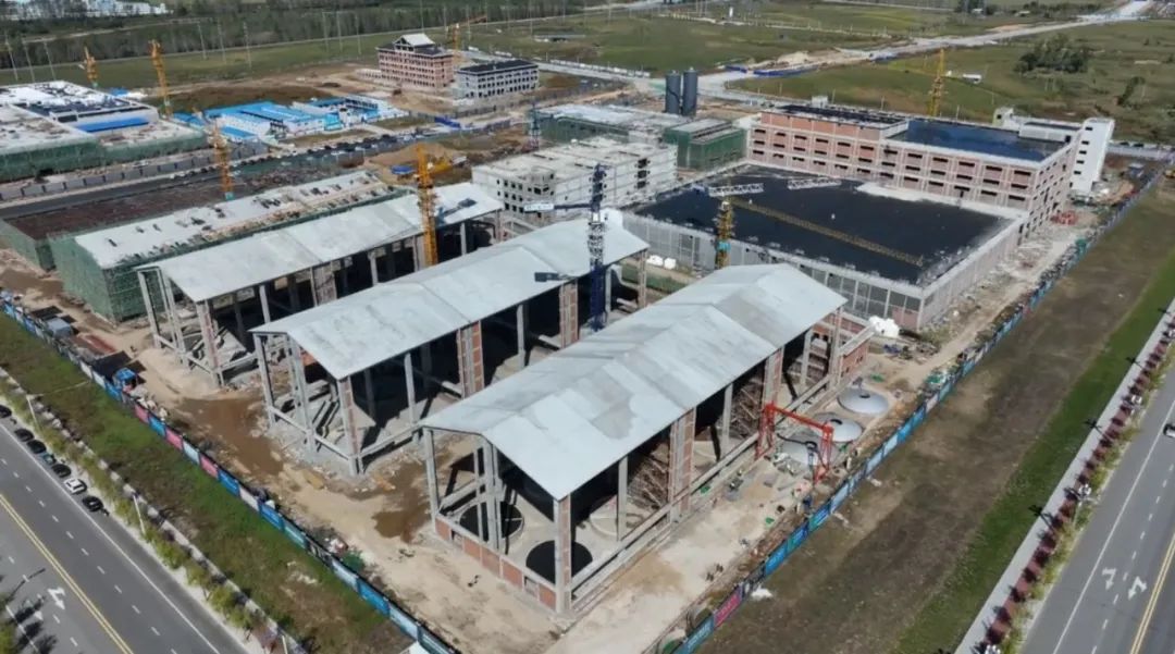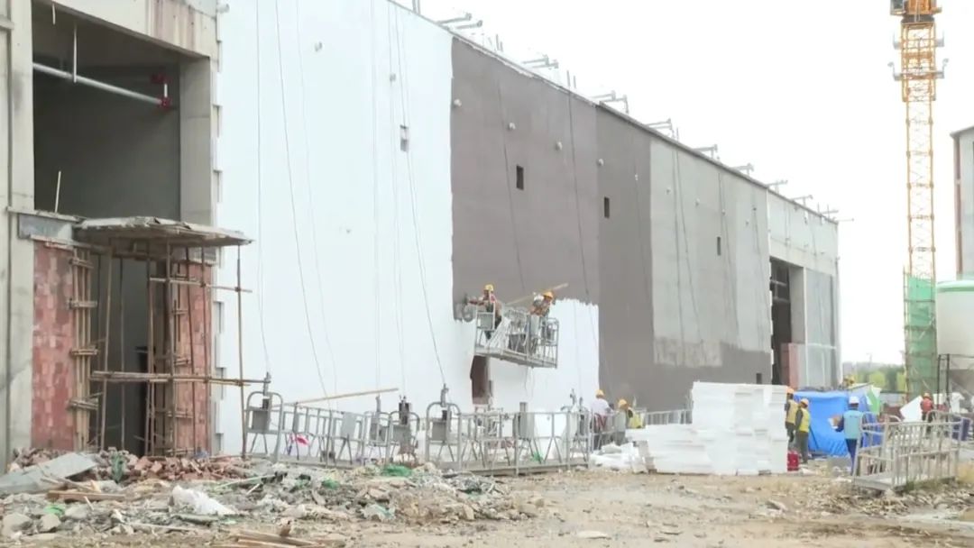 在项目现场,工人在工地内往来穿梭,各种大型机械设备轰鸣声此起彼伏,建设者们紧张有序抢抓施工期,确保工程进度。据项目负责人介绍,现在进入二次装修和外墙装饰阶段,多个车间的设备已经进场,在十月末之前全部能进场,今年冬天设备进入安装调试,预计明年试生产。