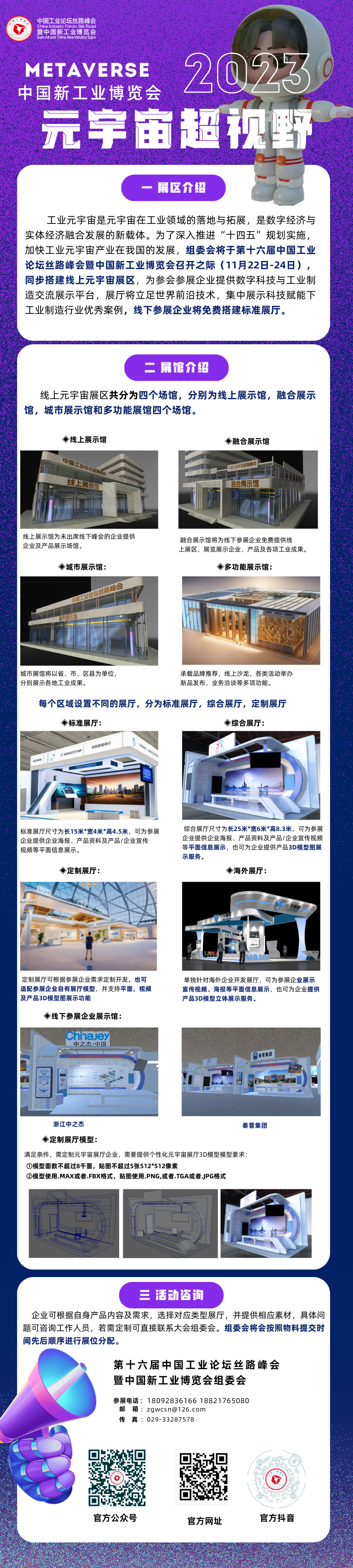 企业可根据⾃⾝产品内容及需求,选择对应类型展厅,并提供相应素材,具体问题可咨询⼯作⼈员,若需定制可直接联系大会组委会。组委会将会按照物料提交时间先后顺序进行展位分配。