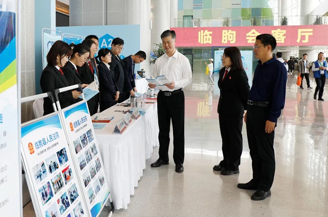 10月13日,临朐法院党组书记、院长马瑛杰现场察看建博会法官服务站运行情况,沈汝业副院长参加活动。