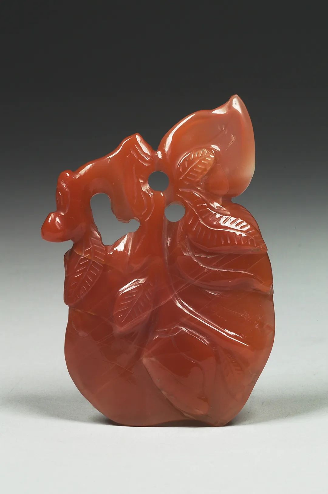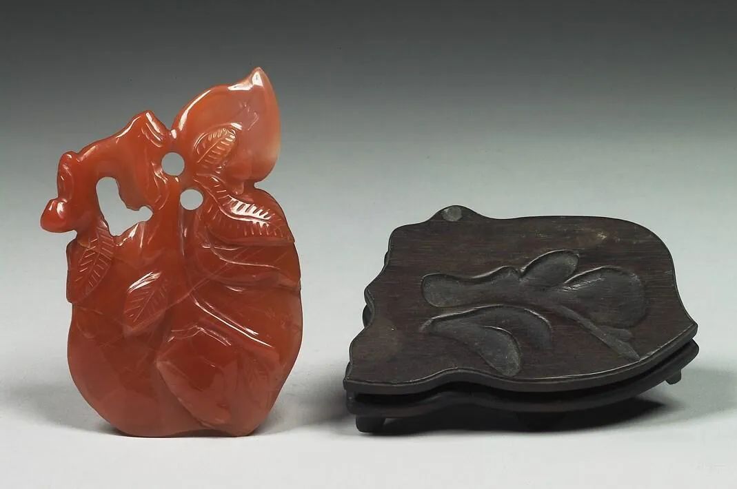 玛瑙,色红光润,有璺。砚作桃果形,带有镂空枝叶,延伸至背面。附木座。
