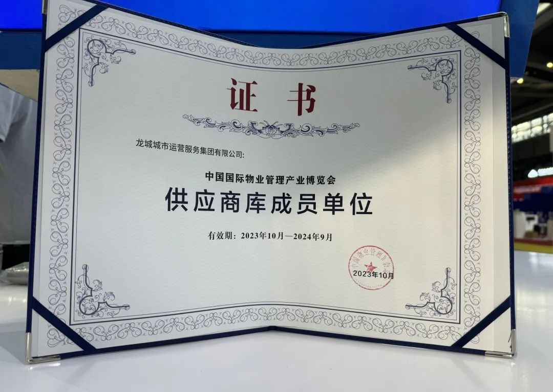 在本届“2023中国国际物业管理产业物博会”闭幕上,龙城服务集团荣获“供应商库成员单位”荣誉证书。