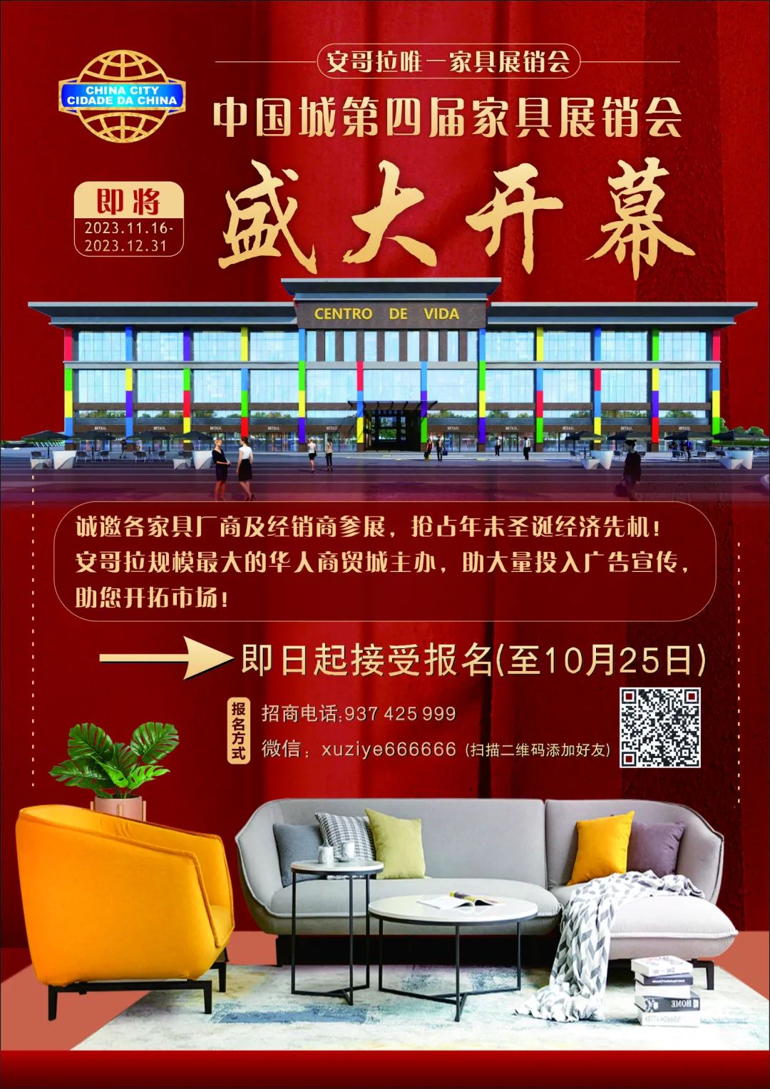 2023年11月,即将到来的中国城第四届家具展将不辱使命,砥砺前行,为本土家具产商打造出一个更耀眼的舞台,促进安哥拉制造走向世界!