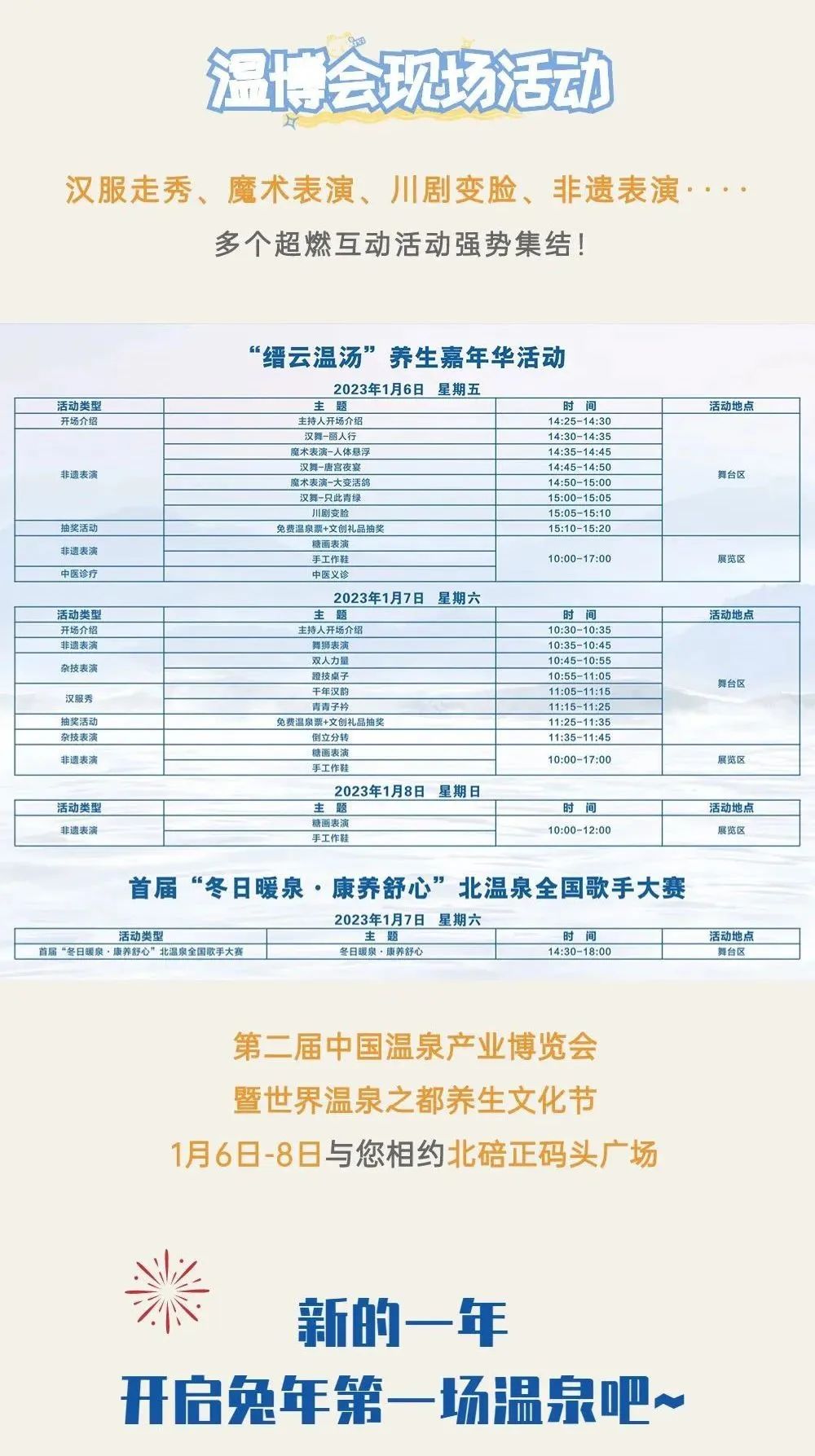 此外,同期还将举办“泉声心”全国歌手大赛、“巴山夜雨”诗歌奖颁奖典礼、温泉旅游惠民消费季、“缙云温汤”养生嘉年华、首届“冬日暖泉·康养舒心”北温泉全国歌手大赛决赛等精彩纷呈的活动。