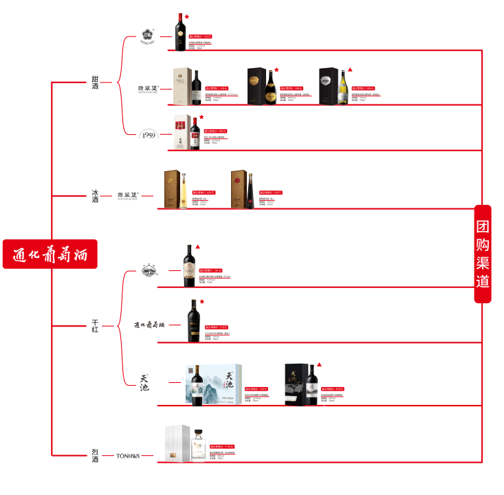 从团购业务产品划分来看,主打四个系列,分别是:甜酒、冰酒、干酒、烈酒,每个品类都是通化葡萄酒品质与酿造工艺的集大成者。
