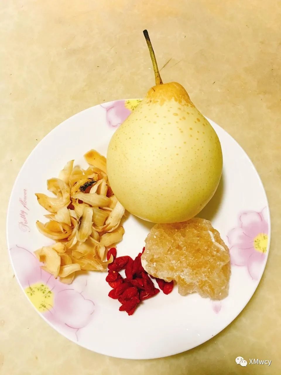 雪梨一个,百合10克,枸杞子+银耳适量放一些也行,冰糖适量。