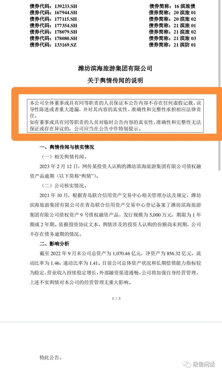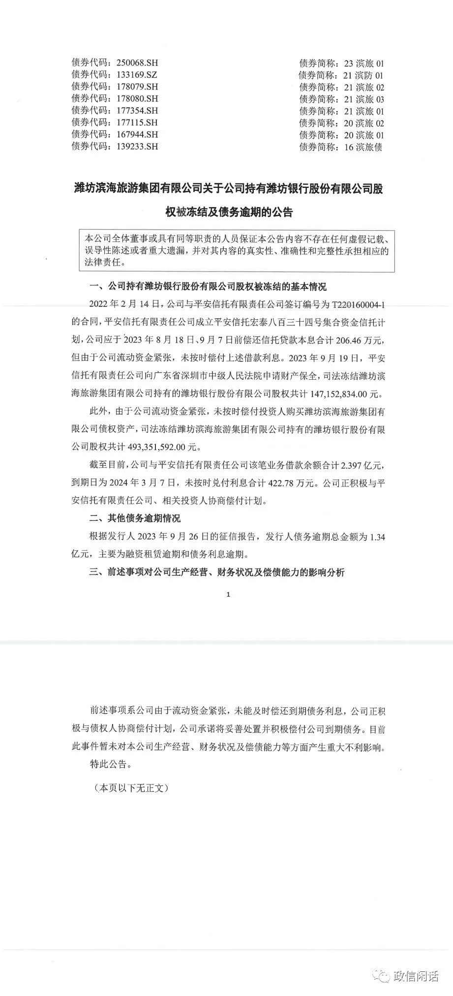 2023年2月15日,滨海旅游集团有限公司发布关于舆情传闻的说明,否定了定融逾期,但仔细推敲之后可以发现他只是打了擦边球,指鹿为马,估计这个办法也是他们想尽脑汁想出来的,这就是把投资者的智商按地上使劲地摩擦,难道没人对公告内容的真实性、准确性和完整性承担法律责任吗?2023年10月11日,发不了关于潍坊银行股权被冻结及债务逾期的公告,拖欠平安信托,信托公司也不惯着,直接冻结你的优质资产,此前把某家某租赁公司也站出来发布了风险警告,就想问问,滨海旅游集团你现在除了债券不敢不还,还有啥机构没拖欠了,定融就不说了,第一个拿来祭旗的!