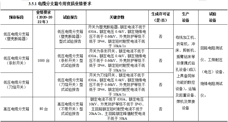 对于参加国家电网有限公司供应商资质能力信息核实的申请人:(1)应按要求在国家电网有限公司电子商务平台(以下简称“ECP2.0系统”)中生成资质业绩凭证单(以下简称“凭证单”)并在投标工具-资质业绩文件处上传提交。凭证单载明的有效已核实数据将作为评审依据,不需提供支持证明文件(试验报告除外)。未提供(上传)凭证单的申请人,其申请将被否决。(2)业绩以凭证单载明的已核实数据为准,其他业绩及其支持证明文件无需编入申请文件,编入的不作评审。(3)除供货业绩外需要更新补充已核实范围外相关证书、生产试验设备、生产厂房的,应提交对应支持证明文件扫描件。补充证书(出具时间)、生产试验设备(销售合同签订时间)、生产厂房(土地使用权证或房屋产权证出具时间)仅接受2023年4月14日之后出具的支持证明文件扫描件。(4)无论是否有已核实数据的试验报告,均须提供完整版的试验报告扫描件。若申请人未提供满足资格预审文件要求的试验报告扫描件,在资格预审评审阶段将会对申请人带来不利影响。(5)核实以外的补充内容应在技术文件-资质业绩集中应答文件处编制提交,同时通过供应商资质填报工具将相关信息录入ECP2.0系统中,提交对应支持证明文件等扫描件后生成凭证单并上传。具体操作端口详见第四章资格预审文件格式。对于未参加国家电网有限公司供应商资质能力信息核实的申请人:(1)需要按《资质业绩信息集中应答文件》格式填写应答文件表格,并按其“编制说明”提供对应支持证明材料;同时通过供应商资质填报工具按照模板要求提前将全量资质信息录入ECP2.0系统中,并上传附件证明材料,未提供全量资质信息可能会对申请人带来不利影响。将全量资质信息生成凭证单后通过投标工具的资质业绩模块上传提交,具体操作端口详见第四章资格预审文件格式。未提供(上传)凭证单的申请人,其申请将被否决。(2)应按第四章资格预审文件格式要求制作《供应商未参加资质能力核实说明文件及承诺函》并提交。(1)有效既有业绩时间范围:2020年01月01日至2022年12月31日。资格预审申请人提供的有效期间内合同业绩数量应满足专用资质条件要求。业绩时间计算以合同签订时间为准,业绩数量(金额)计算以提供发票为准。(2)对于参加国家电网有限公司供应商资质能力信息核实的申请人,其业绩以资质业绩凭证单载明的已核实数据为准,不需提供支持文件,资质业绩凭证单载明的有效的已核实数据作为评审依据。核实时间段内的业绩支持文件无需编入资格预审申请文件,编入的不作评审。(3)对于未参加国家电网有限公司供应商资质能力信息核实的申请人业绩支持证明材料要求:销售业绩必须提供对应的合同和发票扫描件,发票开具时间须在2020年01月01日至2023年4月14日内,发票扫描件后须附通过国家税务总局全国增值税发票查验平台(网址:https://inv-veri.chinatax.gov.cn/)查验的发票结果截图,“一发票一截图”,未提供对应发票查验结果截图或结果截图与平台查验结果不一致的发票金额(数量)不予认可。对于存在造假行为的申请人,将严格按照《国家电网公司供应商不良行为处理管理细则》进行处理。所有业绩支持证明材料内容须保证清晰、可辨认且不得遮盖、涂抹。合同扫描件可提供合同封面、签字页及其货物清册即可,合同封面、签字页及其货物清册须一一对应,按时间顺序由远及近排列合同及发票扫描件,并制定目录。(5)既有业绩合同供货方和实际产品生产方必须均为申请人。④与非最终用户(即业主单位或负责所供货物运行、使用的单位以外的主体)签订的供货合同,但申请人作为外购外协方与配网成套设备的中标人签订的成套设备的供货合同除外;⑤出口业绩的外贸合同、发票、报关单及对应产品型号等信息资料难以核实或不全的;(7)母公司与子公司之间、同一母公司下的各个子公司之间、存在控股关系的不同公司之间的业绩不能相互替代。(8)收购其他企业,被收购企业注销的,收购方可继承被收购方的业绩。(9)申请人如发生收购、重组、改制、合并、分立、名称变更等情况,须提供充分且合法、有效的证明材料,供资格审查委员会审查。(1)申请人应提供具备相应资质的第三方检测机构出具有效的型式试验报告,关于报告具体要求详见各标段相关规定。关于检验(检测)报告出具机构详见相关产品的资质能力核实标准规范;(2)无论资格预审申请文件中资质业绩凭证单是否有已核实的试验报告记录,均须提供完整版的试验报告扫描件。若申请人未提供满足资格预审文件要求的试验报告扫描件,在资格预审评审阶段将会对申请人带来不利影响。对于未参加国家电网有限公司供应商资质能力信息核实的申请人,须提供试验报告扫描件。(5)产品的检测报告符合相应的国家标准、行业标准、国家电网有限公司物资采购标准规定的试验项目和试验数值的要求;(6)各类试验报告均系针对具体型式规格产品的试验报告。(9)在后续招标中,如招标人在2.2物料清单外,增加特殊物料需求的,申请人按照招标文件要求,在投标时或供货前补充相关试验报告。(10)补充报告(出具时间)仅接受2023年4月14日之后出具的支持证明文件扫描件。4.1.3生产许可证或其他证书审核标准(各标段专业资质条件如有要求)(1)资格预审申请文件中资质业绩凭证单“有”已核实的