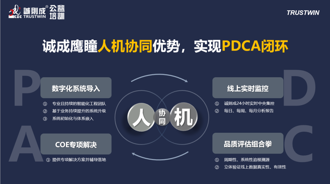 诚成鹰瞳可以同时利用系统和第三方服务评估的优势,串联数字化系统的导入、线上实时监控、线下溯源验证的评估组合拳、专项提升方案,形成一个以新技术为依托,人机协同的 PDCA 管理闭环,完成品控范式的升级。
