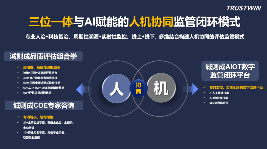 这一人机协同监管闭环的新模式由诚则成历经两年的市场调研,通过研发、整合并打通人工智能(AI)、物联网(IoT)、信息化系统(MIS)等技术,与人的专业经验有机结合而成,是目前行业内外的重大革新产品。