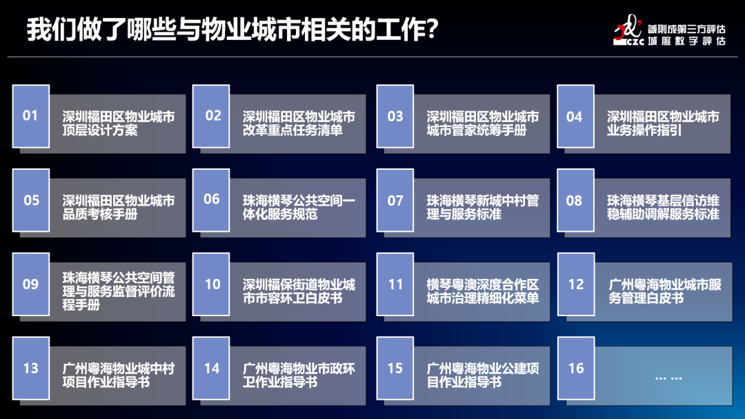 诚则成作为行业标准的制定者以及“物业城市”领域的先行者,先后为深圳福保街道、珠海横琴新区、深圳福田区等地的“物业城市”实践搭建了顶层设计、服务标准及服务质量评估规范。