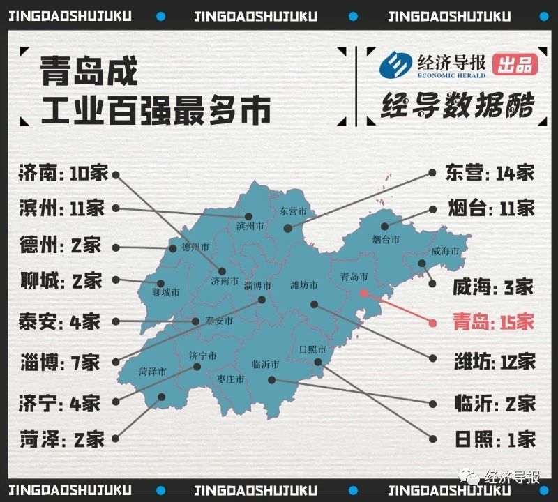 从地域分布上看,除枣庄未有入选企业外,全省15个市均有企业入选综合百强榜及工业百强榜。其中,综合百强榜入选企业最多的市是济南、青岛、东营,分别为19家、17家、15家,占据综合百强榜半壁江山。潍坊、滨州各有9家,烟台8家,淄博7家,临沂、济宁各4家,泰安、聊城各2家,菏泽、日照、威海、德州均有1家。