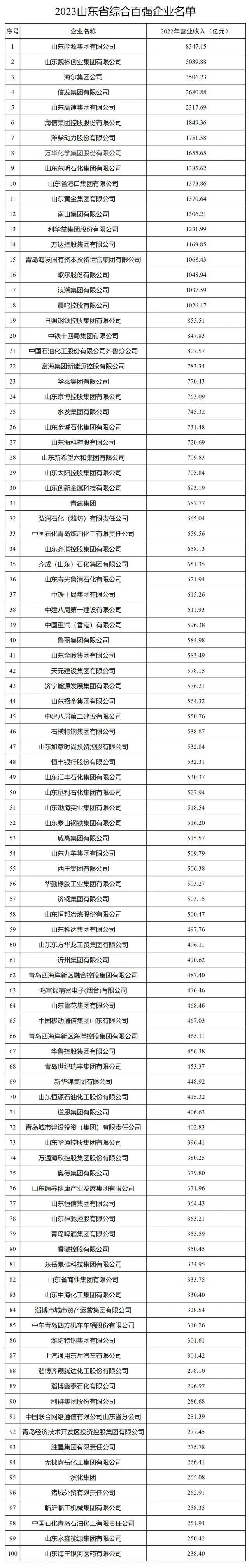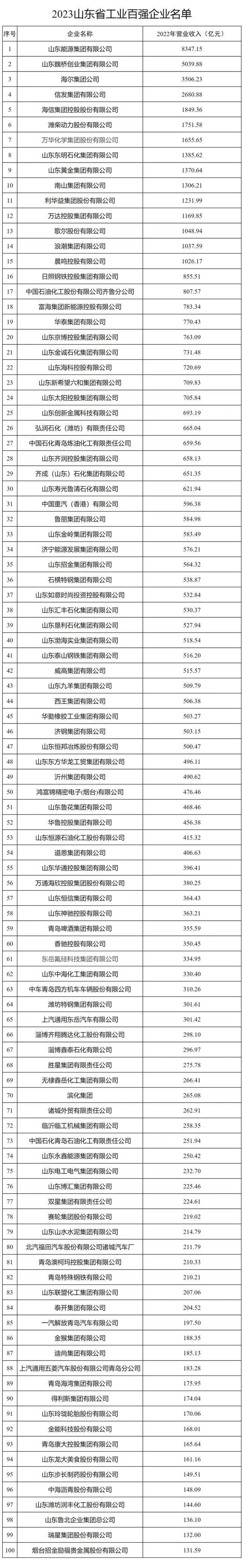 10月11日,山东省工业和信息化厅公示了2023山东省百强企业名单,根据自愿申报原则,以上一年度营业收入为依据,组织开展了2023山东省百强企业评选工作。