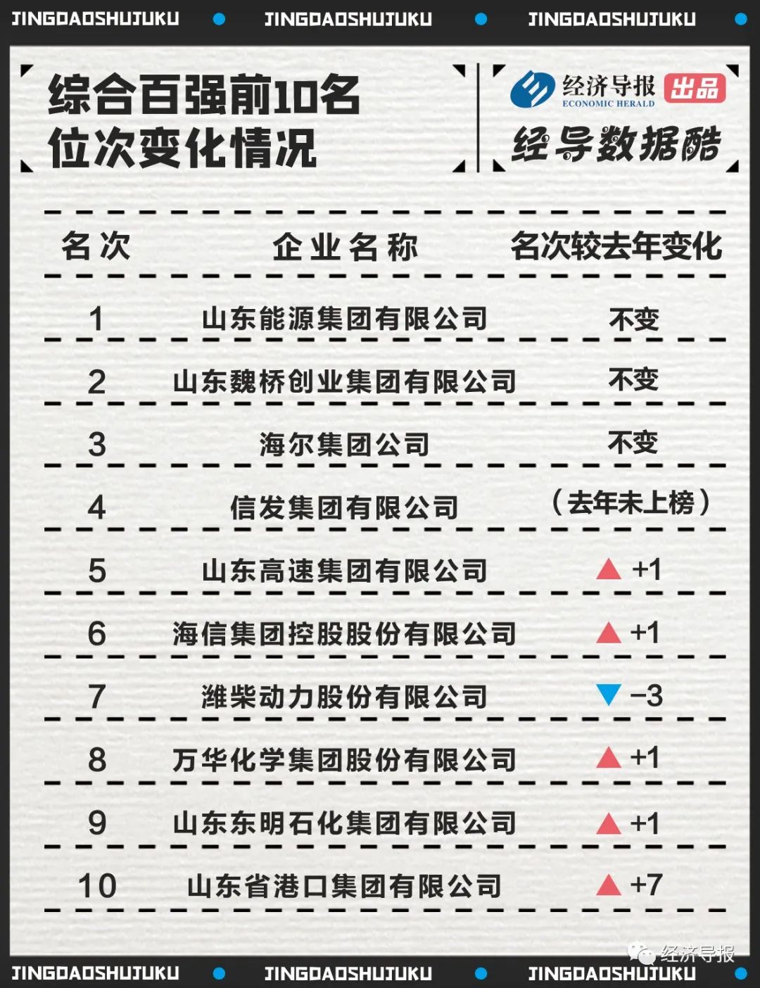 据经济导报解析,从前10名的位次变动来看,前三名保持不变,多数企业名次略有提升。山东能源集团、山东魏桥集团、海尔集团、信发集团同时位列2023山东省综合百强企业、2023山东省工业百强企业前四名。