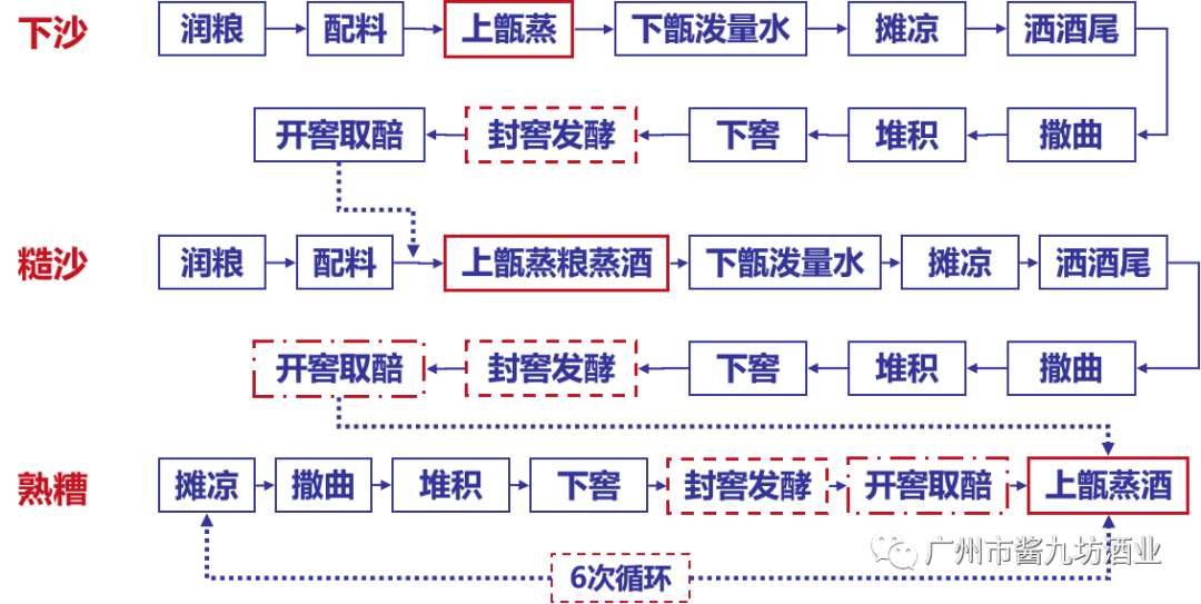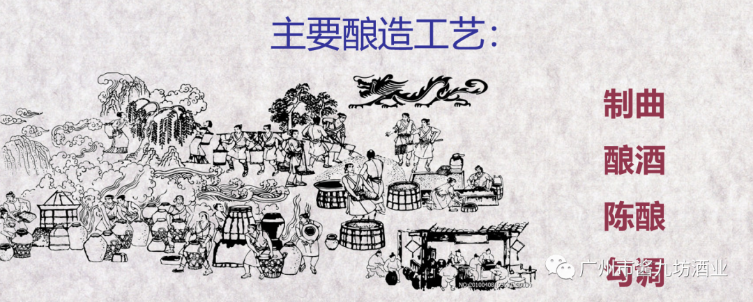 正宗酱酒采用优质小麦制造高温大曲,与其他酒曲相比X生产季节性强,要求“伏天踩曲”,即“端午踩曲到重阳节结束制曲温度高达60°以上,称为“高温制曲”,是酱香大曲风格特点形成的关键,也是酿制酱香白酒的重要环节。新生产的大曲不能直接应用于酿酒,需经过六个月以广州市酱九坊酒业上的贮存,所以“大曲贮存时间长高温堆积发酵:堆积是指发酵物料在入窖发酵前堆积于酿酒车间的晾堂上,目的是为了捕获车间空气中的酵母等微生物,另外就是为了提高入窖温度高温馏酒:高温留酒指的是蒸留时冷却器中流出酒的温度较高,有利于低沸点的小分子物质从酒中逸出,如甲醇、乙醛等对人体有害的物质,有利于提高酒的品质12987工艺:1年生产周期 2次投料 9次蒸煮 8次发酵 7次取酒新酿酱酒必须经过三年以上存放陈化,才能勾兑,所以酱酒醅烤出来以后必须经过“长期陈酿”这道工序。存放一年后,将此酒“盘勾”,盘勾两年后,共经过三年的陈酿期,酒已基本老熟,进入了“调勾”和“品勾”的精心勾兑阶段。精心勾兑后的酱酒,还需要在酒库里继续陈酿。 勾调是酱酒独特工艺的组成部分,是酱酒保持质量,保持风格最重要的、必不可少的一个生产环节。 由于各轮次、各甑酒的质量不尽相同,要把各具不同微量成分和不同量比的酒达到适宜的比例,使其风格完美,就必须用勾调这一生产工艺,而酱酒勾调最独特的地方是在整个勾调过程中,用本厂所酿造的不同香型,不同轮次,不同酒度,不同年龄的酱酒相互勾调,相互取长补短,达到完美。