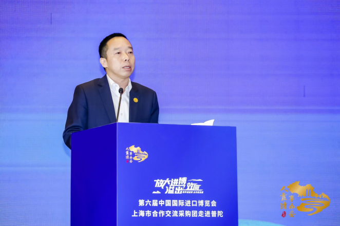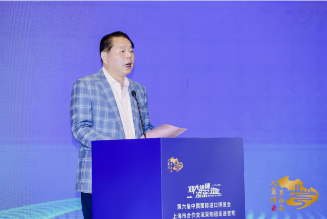 肖文高代表普陀区委、区政府向出席活动的各位领导和嘉宾表示欢迎,他在致辞中表示,近年来,普陀认真贯彻党中央国务院、市委市政府决策部署,发挥自身优势、抢抓开放机遇,以“中华武数”科创布局的构建、“半马苏河”工笔画的绘就、“一带一心一城”重点地区的建设为抓手,不断放大进博会溢出带动效应,交出了可喜的成绩单。普陀将始终秉承“人靠谱(普),事办妥(陀)”的精神,全力以赴做好第六届进博会各项服务保障工作,同时以此活动为契机,充分发挥“6 天+365 天”交易服务平台功能,营造一流的营商环境,搭建开放广阔的舞台,让进博机会、进博红利、进博成果惠及更多企业。